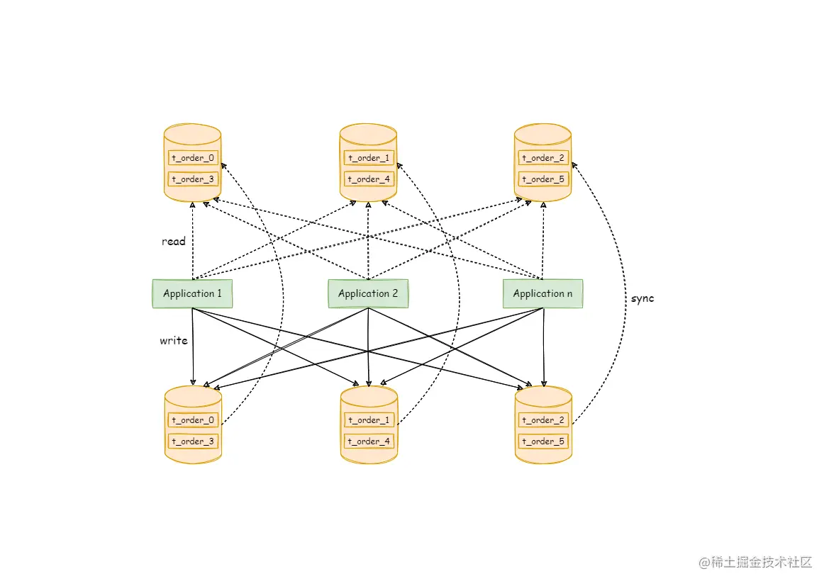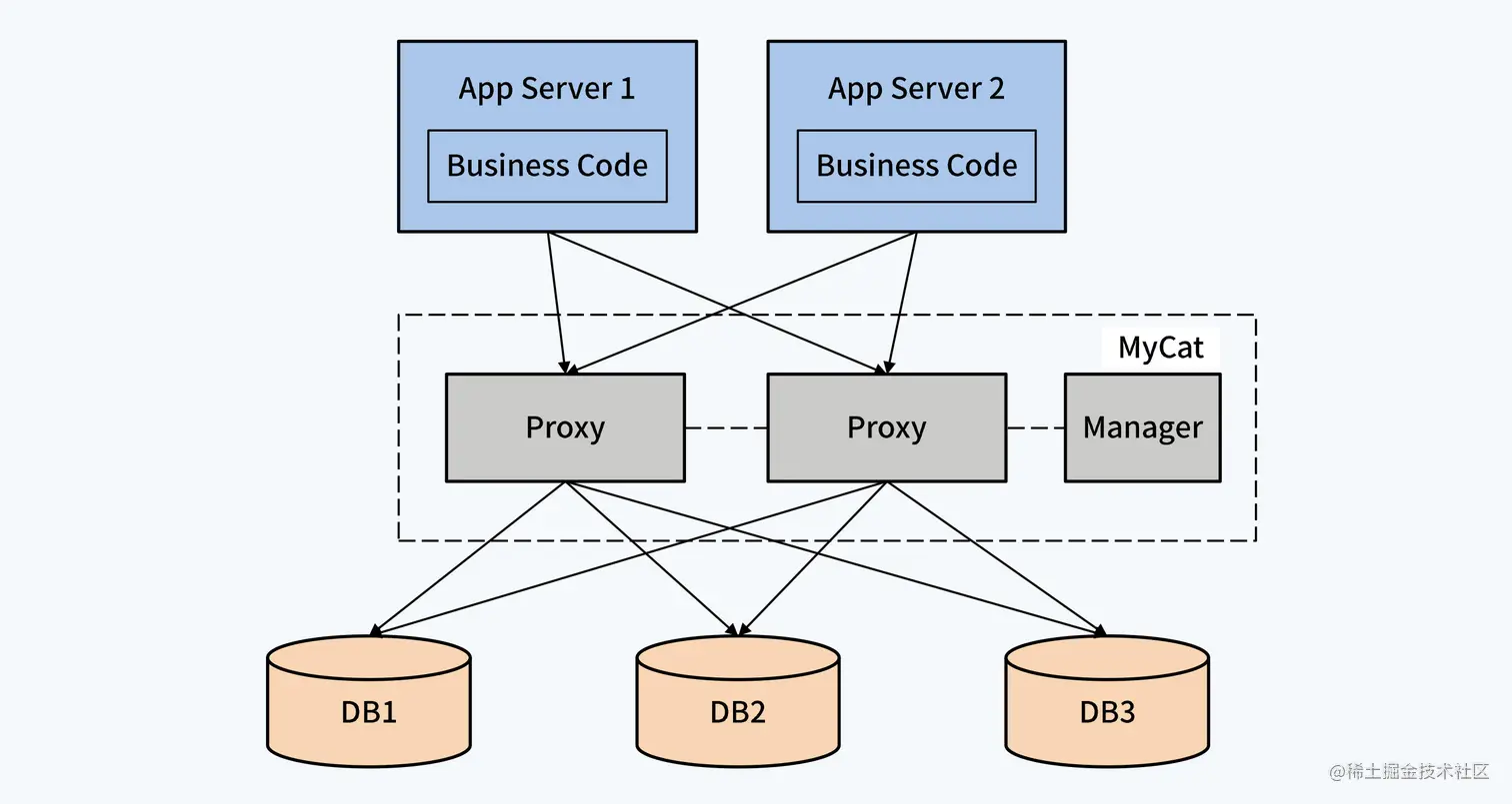 很多分库分表方案会演进到这个阶段,比如 MyCat。