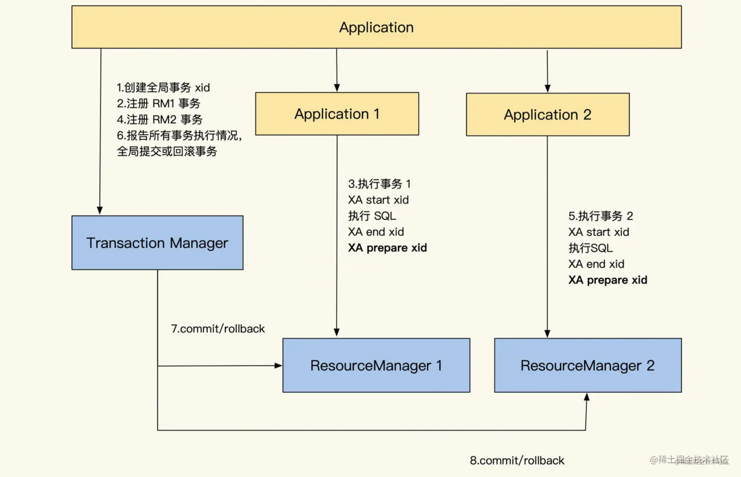 2PC 的处理过程也分为准备和提交两个阶段,每个阶段都由事务管理器(TM)与资源管理器(RM)共同完成。其中,