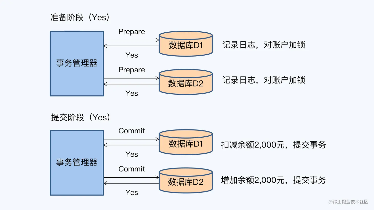 - 第二阶段是提交阶段,如果所有数据库的反馈都是 Yes,则事务管理器会发出提交(Commit)指令。这些数据库接受指令后,会进行本地操作,正式提交更新余额,给小明的账户扣减 2,000 元,给小红的账户增加 2,000 元,然后向协调者返回 Yes,事务结束。