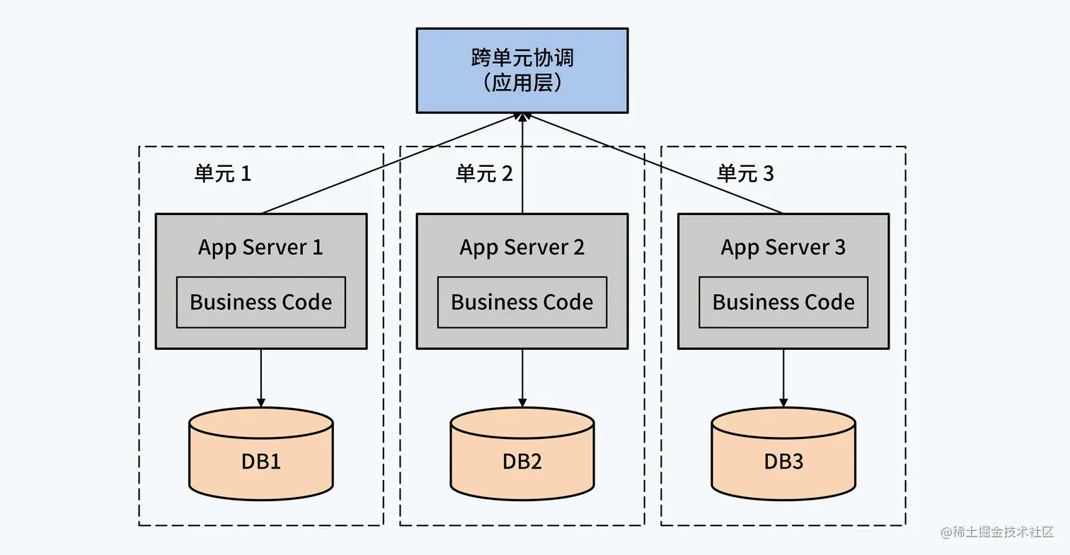 单元化架构是对业务应用系统的彻底重构,应用系统被拆分成若干实例,配置独立的单体数据库,让每个实例管理一定范围的数据。例如对于银行贷款系统,可以为每个支行搭建独立的应用实例,管理支行各自的用户,当出现跨支行业务时,由应用层代码通过分布式事务组件保证事务的 ACID 特性。