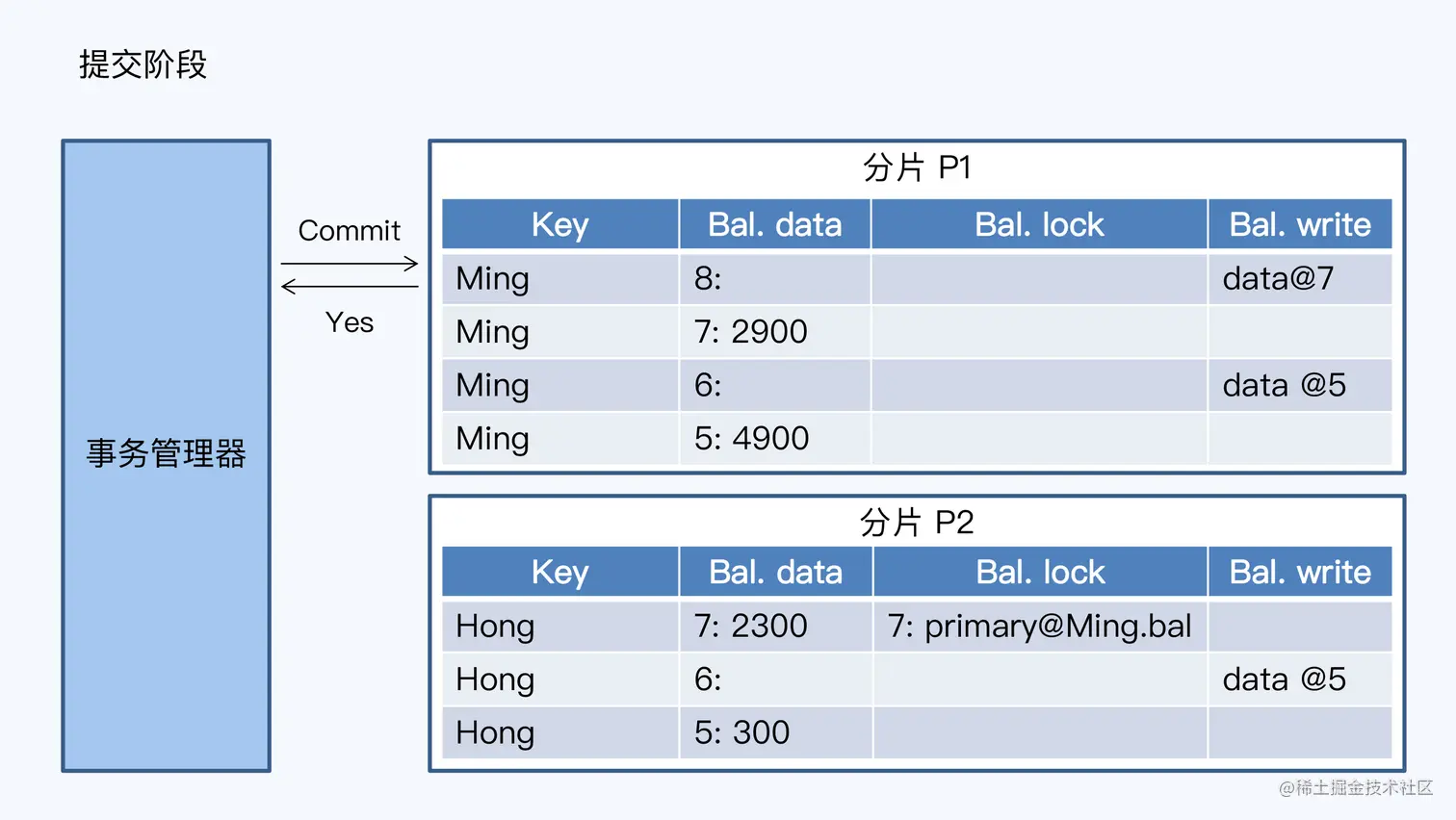 第二,提交阶段,事务管理器只需要和拥有主锁的分片通讯,发送 Commit 指令,且不用附带其他信息。