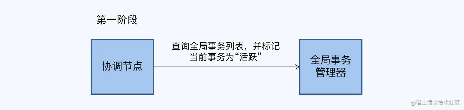 第一阶段,GoldenDB 的协调节点接到事务后,在全局事务管理器(GTM)的全局事务列表中将事务标记成活跃的状态。这个标记过程是 GoldenDB 的主要改进点,实质是通过全局事务列表来申请资源,规避可能存在的事务竞争。