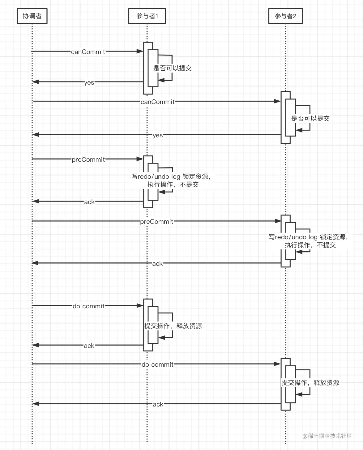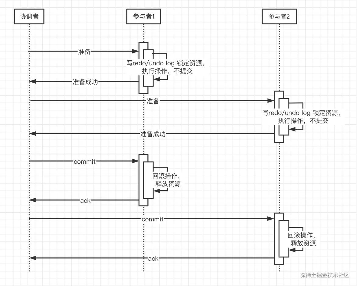 - 第一阶段是准备阶段,事务管理器首先向所有参与者发送待执行的 SQL,并询问是否做好提交事务的准备(Prepare);参与者记录日志、分别锁定了小明和小红的账户,并做出应答,协调者接收到反馈 Yes,准备阶段结束。