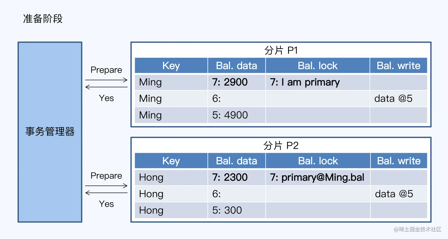 第一,准备阶段,事务管理器向分片发送 Prepare 请求,包含了具体的数据操作要求。