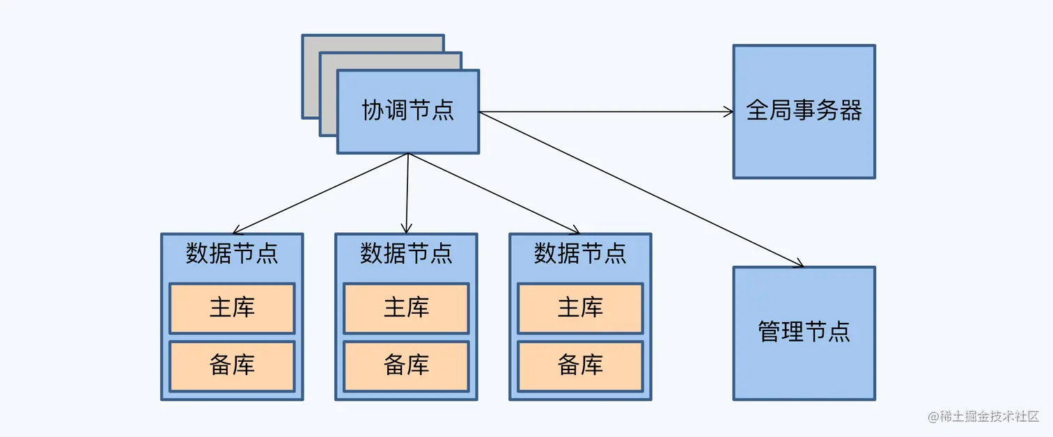 GoldenDB 遵循 PGXC 架构,包含了四种角色:协调节点、数据节点、全局事务器和管理节点,其中协调节点和数据节点均有多个。GoldenDB 的数据节点由 MySQL 担任,后者是独立的单体数据库。