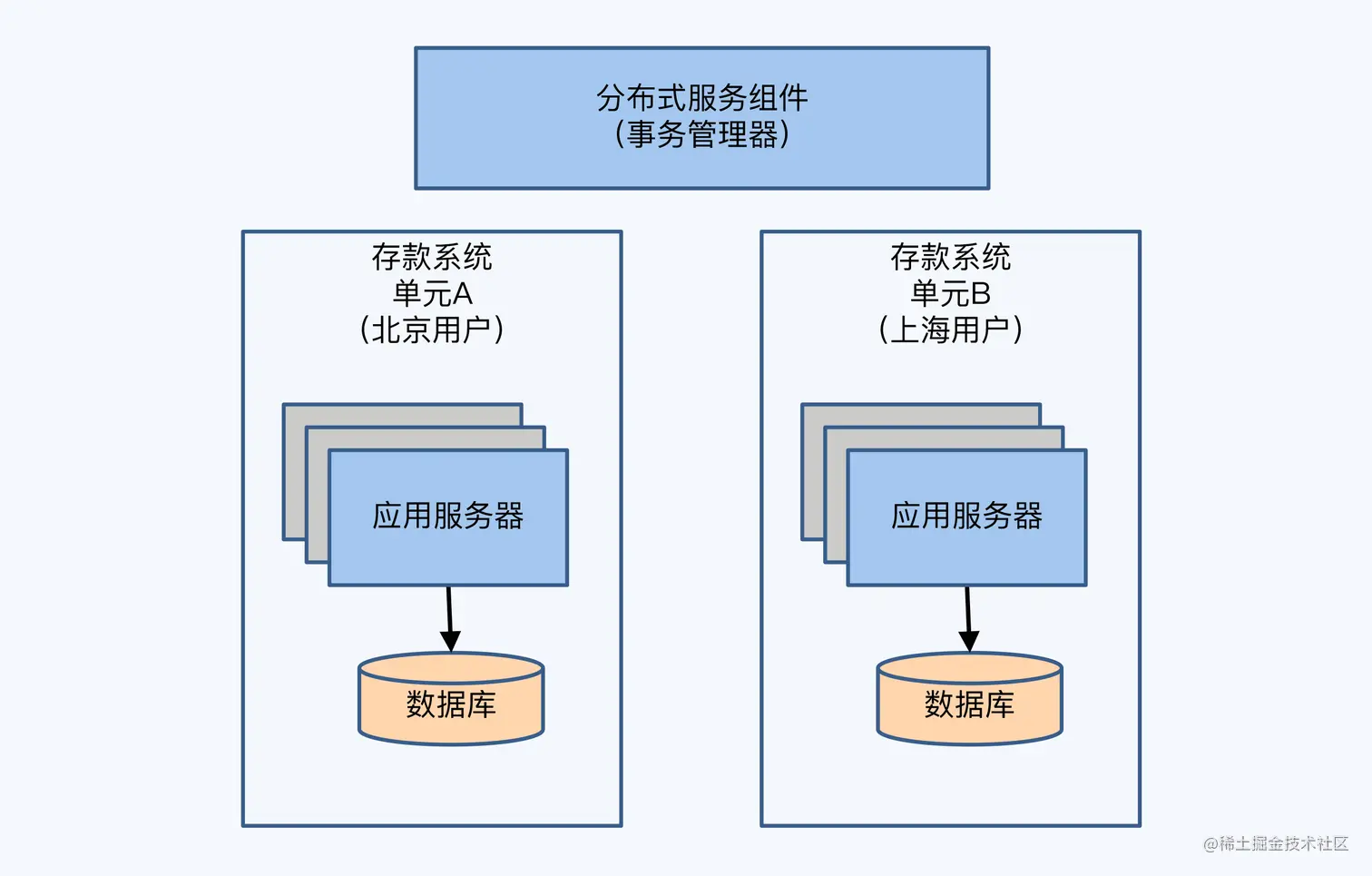 在木瓜银行的存款系统中,所有客户的数据被分散存储在多个数据库实例中,这些数据库实例具有完全相同的表结构。业务逻辑部署在应用服务器上,通过数据库中间件访问底层的数据库实例。数据库中间件作为事务管理器,资源管理器就是指底层的数据库实例。