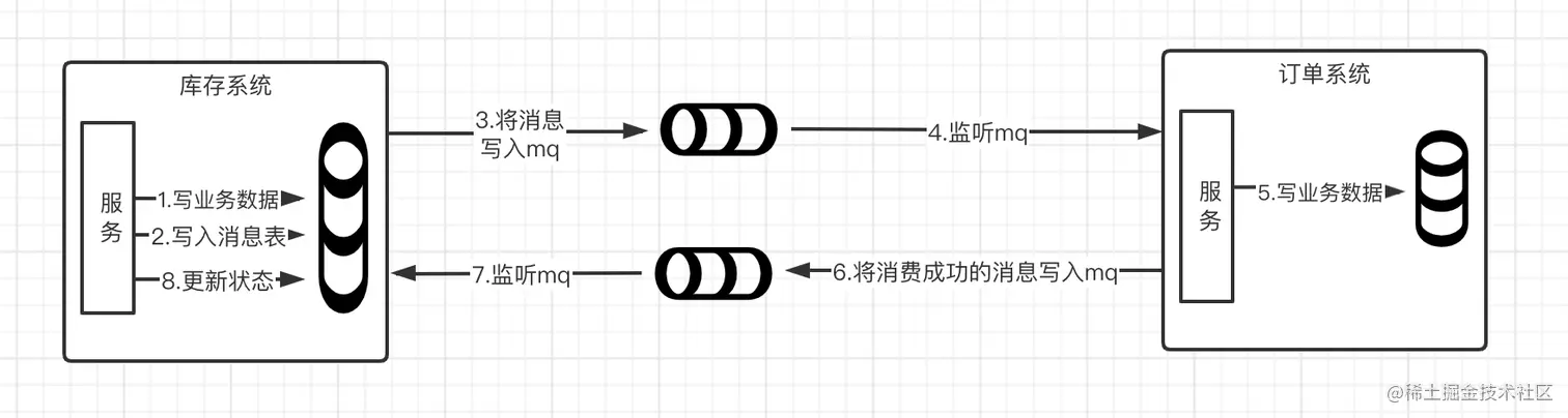 - 同时库存系统又来监听这个订单系统消费成功的消息,当库存服务监听到这个消费成功的消息后,此时再将本地消息表的消息状态改为“已发送”。