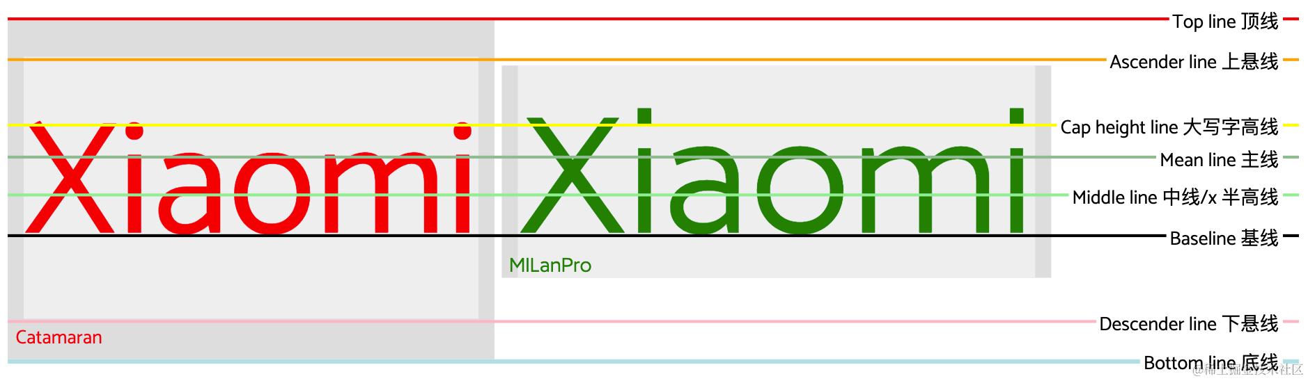 如下图为未使用任何 CSS 参数调整字体的示例,红色文字字体为 Catamaran,绿色文字字体为 MILanPro,绿色文字行高明显比红色文字小。如果 Catamaran 为 web 字体,MILanPro 为后备字体,那么在从 MILanPro 切换为 Catamaran 时,就会发生布局偏移。