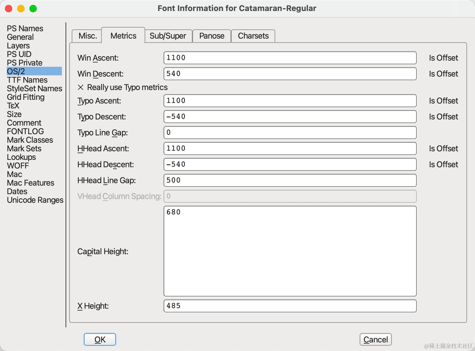 下面以 Catamaran 字体为例(为了展示 Line Gap,此处手动将 Catamaran 字体的 HHead Line Gap 值从 0 调整为 500)。由下图可得知 Catamaran 字体的各个参数(重点关注 110%、54%、50% 这三个值):