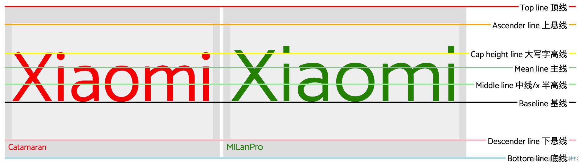 如下图所示,红色为 Catamaran 字体,绿色为 MILanPro 字体,已经调整了 MILanPro 字体的度量参数,使两种字体的度量参数(Ascent / Descent / LineGap)完全一致。最终不同字体相同文本的宽度明显不一致。
