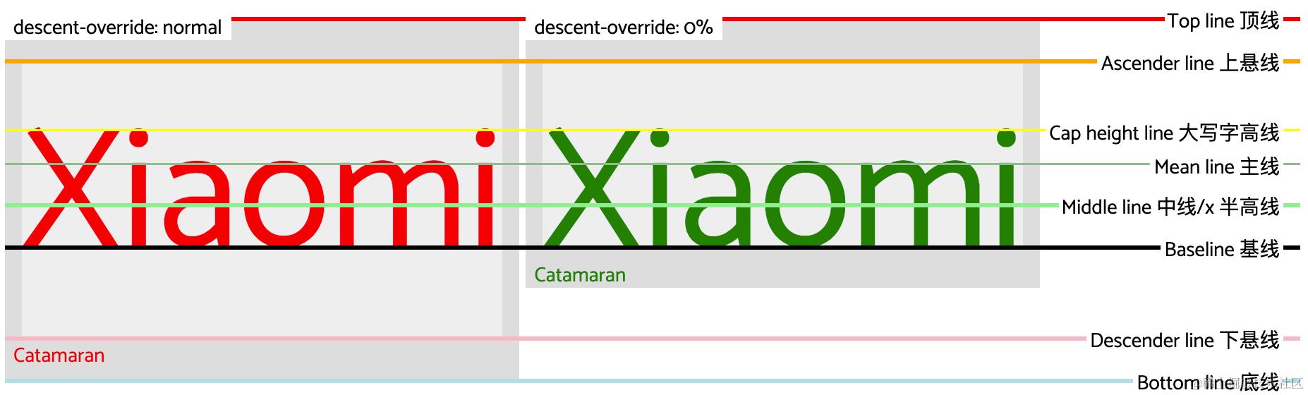 | descent-override | 设置下悬线距离基线的距离 | normal | 默认值,由字体文件决定:(Descent / em) * font-size。初始值为 Descent / Em Size |