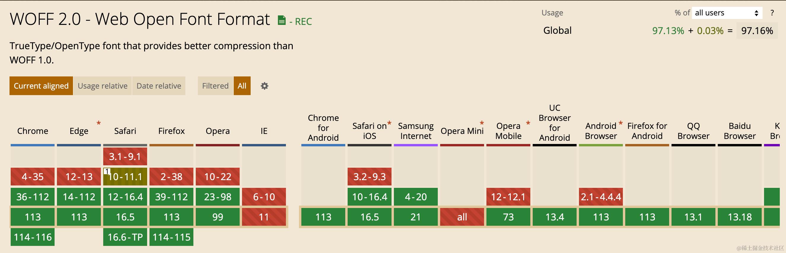 WOFF 字体在 2012 年 12 月被 World Wide Web Consortium (W3C) 推荐使用,IE9+ 浏览器支持。WOFF 2 字体最早在在 2013 年 7 月 Chrome Canary 版本上可以使用,发展到现在,几乎已经成为自定义图标字体使用的标配,目前浏览器的兼容性已经相当不错了。