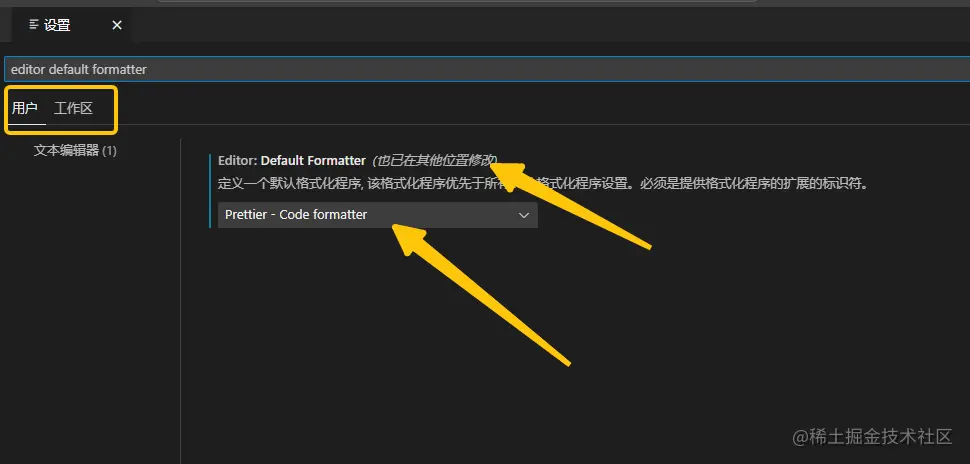 搜索editor default formatter ;在用户区选择 Prettier - Code formatter 为默认格式化程序