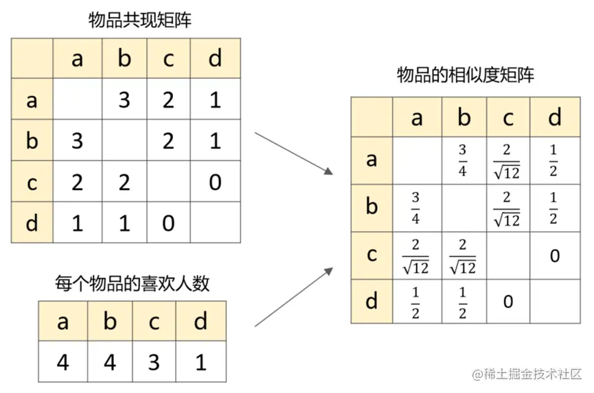 基于第1步计算出来的共现矩阵以及每个物品的喜欢人数,便可以构造出物品的相似度矩阵: