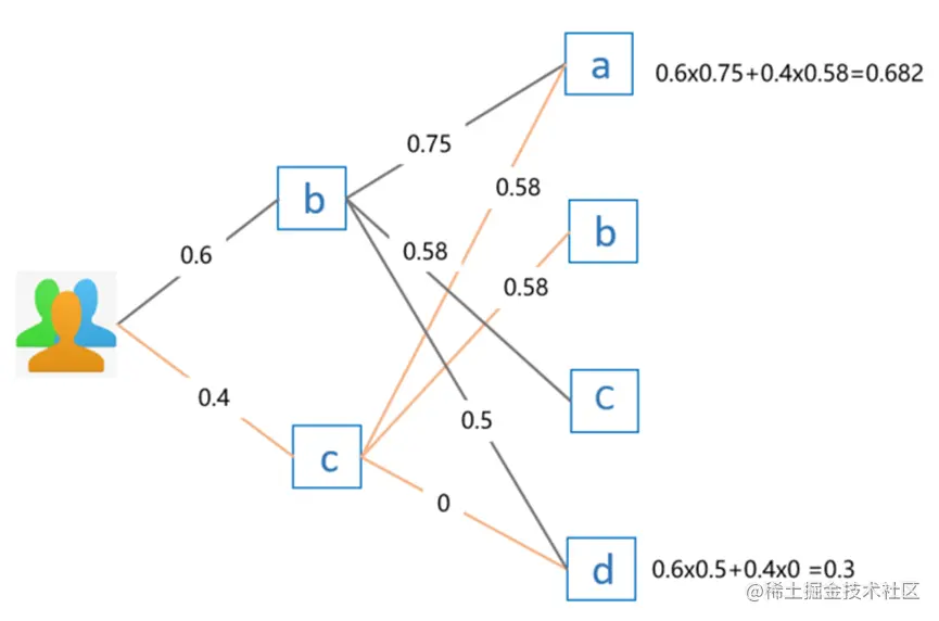 上面的公式有点抽象,直接看例子更容易理解,假设我要给用户 E 推荐物品,前面我们已经知道用户 E 喜欢物品 b 和物品 c,喜欢程度假设分别为 0.6 和 0.4。