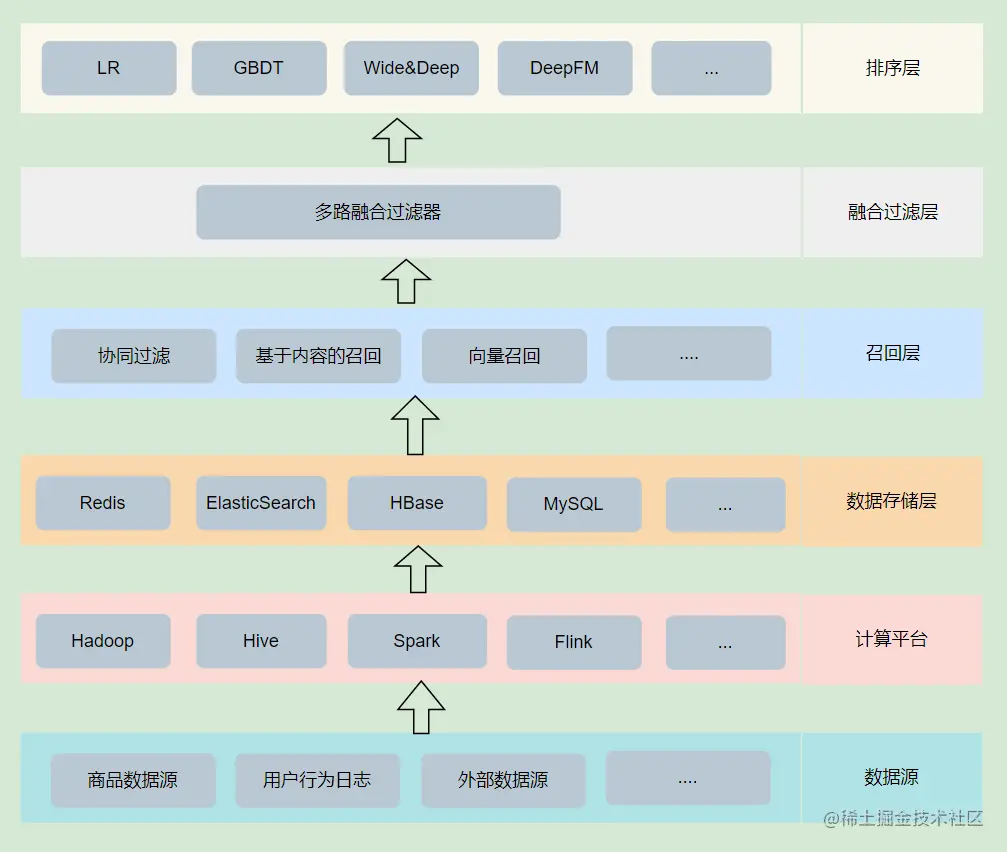 分层:排序层、过滤层、召回层、数据存储层、计算平台、数据源。