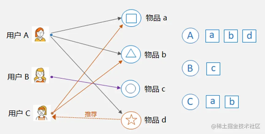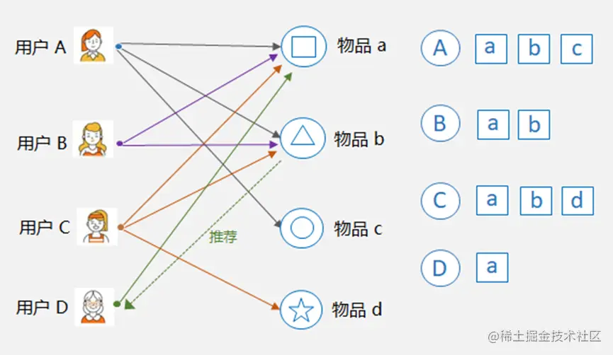 - 基于用户的协同过滤:User-CF,核心是找相似的人。比如下图中,用户 A 和用户 C 都购买过物品 a 和物品 b,那么可以认为 A 和 C 是相似的,因为他们共同喜欢的物品多。这样,就可以将用户 A 购买过的物品 d 推荐给用户 C。