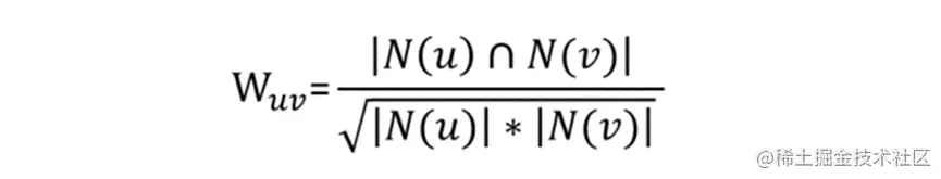 其中,N(u) 表示喜欢物品 u 的用户数,N(v) 表示喜欢物品 v 的用户数,两者的交集表示同时喜欢物品 u 和物品 v 的用户数。