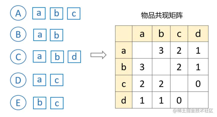 所谓共现,即:两个物品被同一个用户喜欢了。比如物品 a 和 b,由于他们同时被用户 A、B、C 喜欢,所以 a 和 b 的共现次数是3,采用这种统计方法就可以快速构建出共现矩阵。