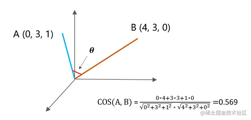 举个例子,A坐标是(0,3,1),B坐标是(4,3,0),那么这两个点的余弦距离是0.569,余弦距离越接近1,表示它们越相似。