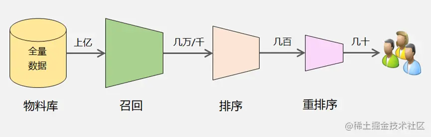 推荐系统本质上就是一个信息过滤系统,通常分为:召回、排序、重排序这3个环节,每个环节逐层过滤,最终从海量的物料库中筛选出几十个用户可能感兴趣的物品推荐给用户。
