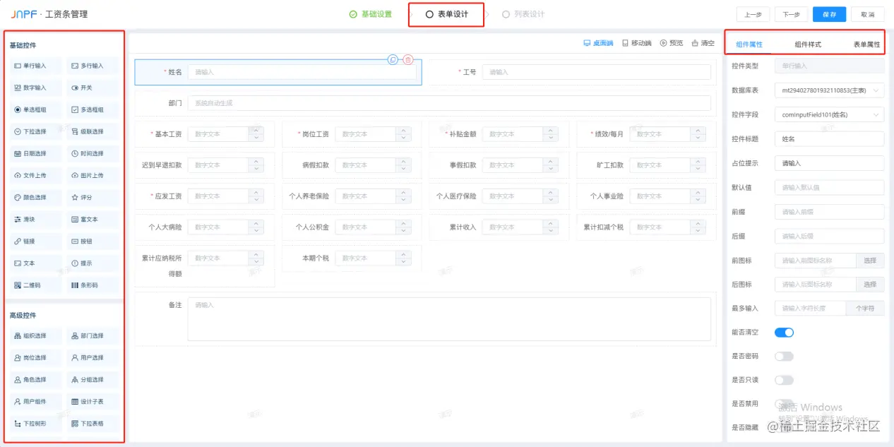 表单中的相关控件,定义了实体的字段。例如薪资信息中的“姓名ID”,字符串类型字段自动浮现为computerfield101(姓名)。此外,数据库表也是自动生成的,当然你也可以手动生成或添加修改