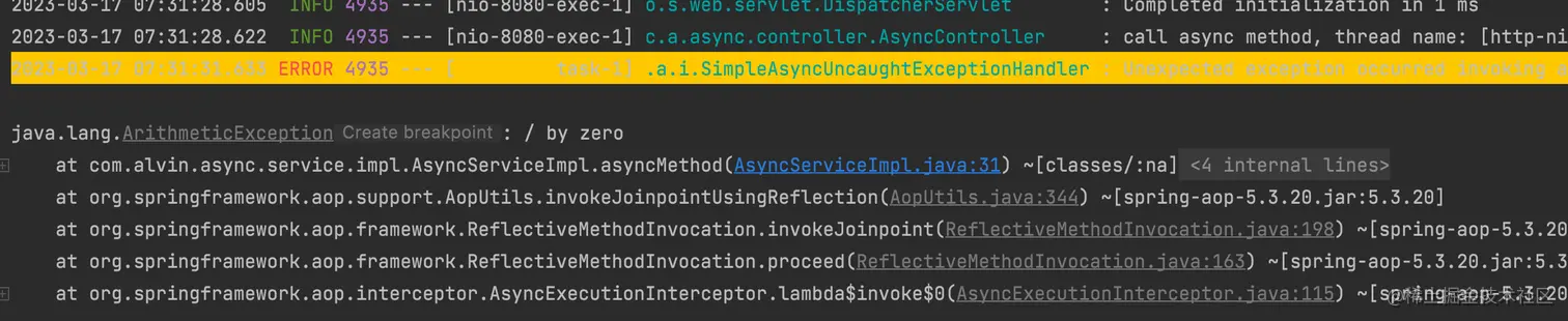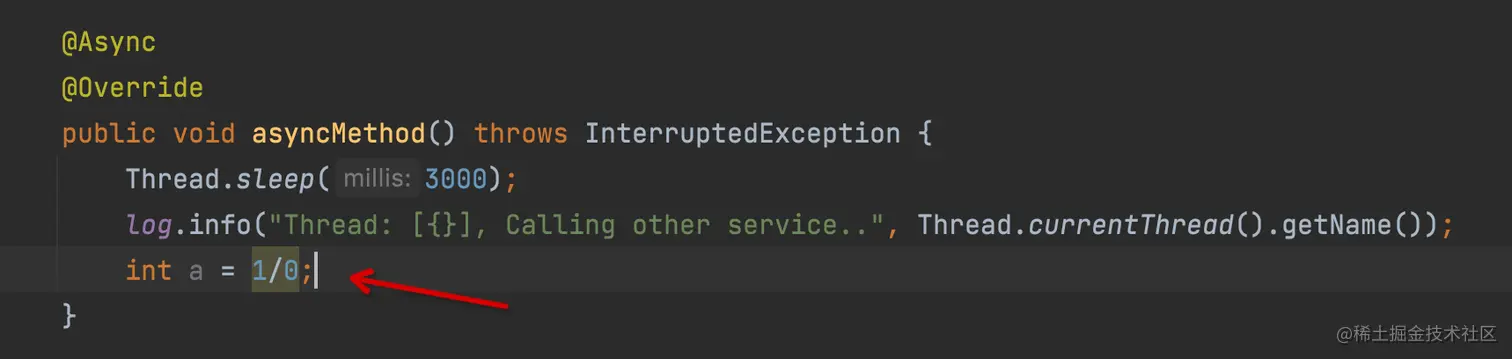 我们现在看看如果异常方法中报错了会怎么样?修改异步代码如下所示,会抛运行时异常: