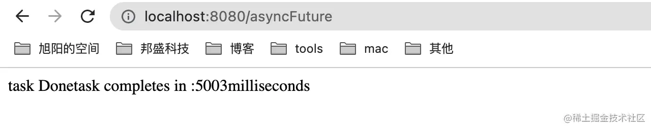 /asyncFuture,发现返回5秒多,难道不是异步的吗?其实也是异步的,看日志可以看出来,只不过我们返回的是Future,调用Futrue.get()是阻塞的。