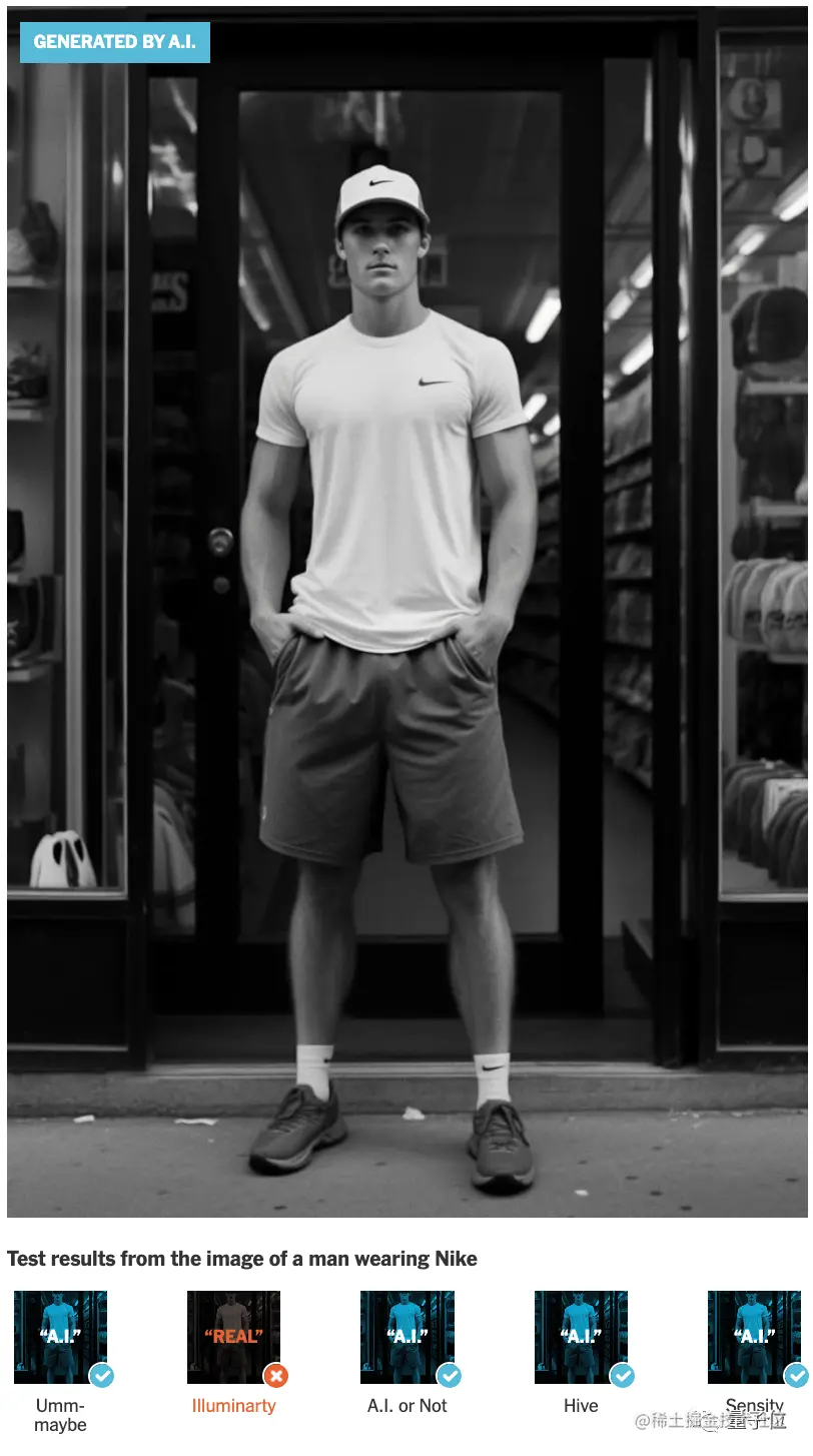 值得一提的是,如果对AI图像进行一些加工处理,AI鉴别器会失效。比如这张Nike男的照片,一开始有4个鉴别器判断它是AI生成的。