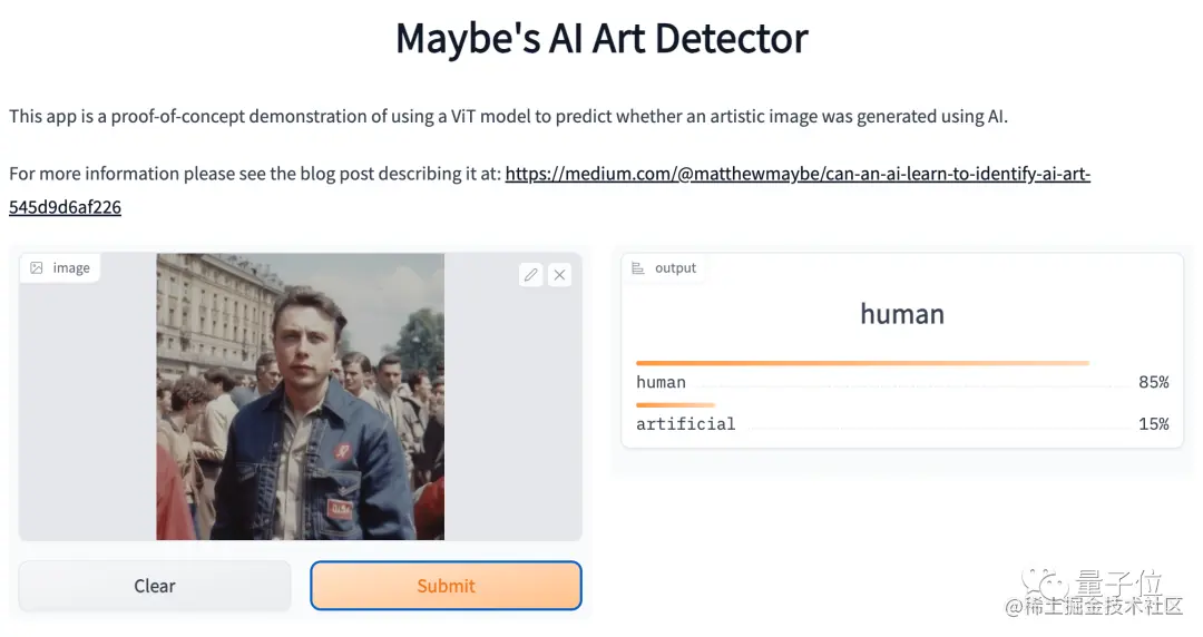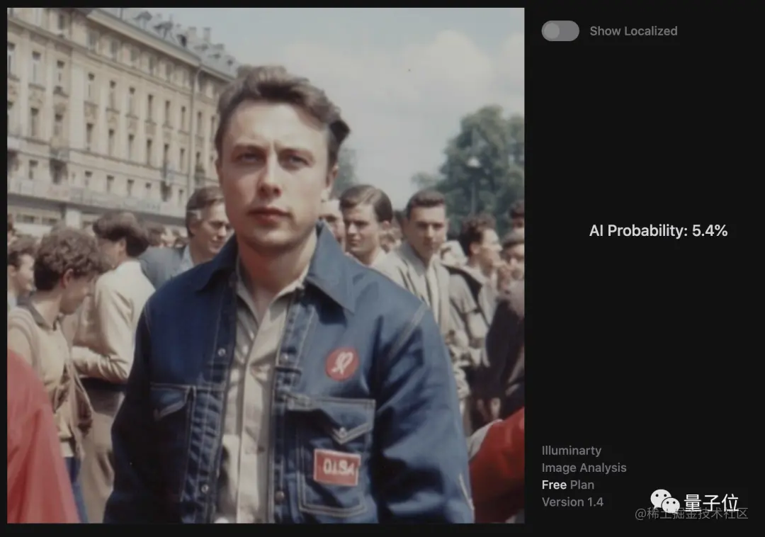 最后,我们也测试了一些能上手实测的鉴别器(Umm-maybe、Illuminarty、A.I or Not)。结果显示,对于“马斯克在苏联”这张图,Umm-maybe觉得它有85%的概率是人类创作的。