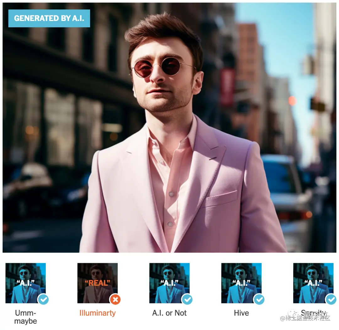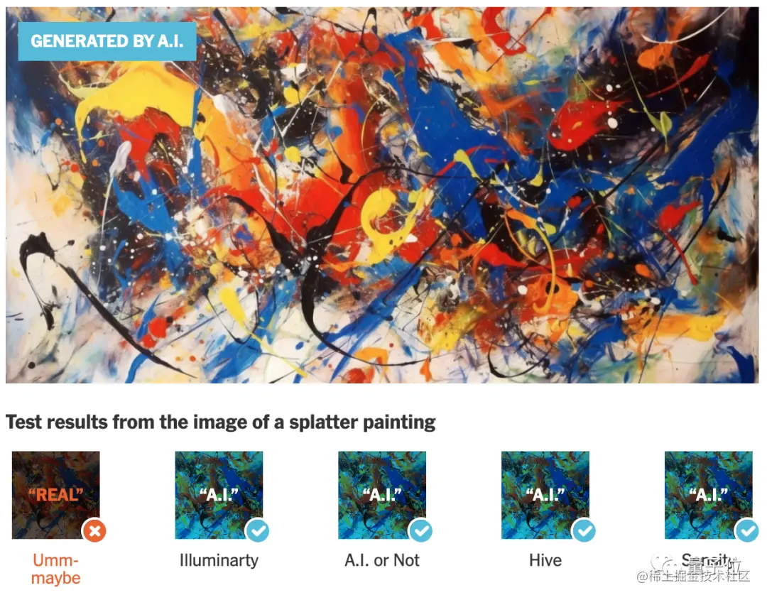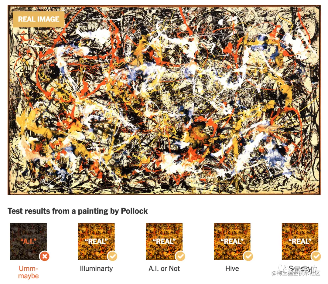 测试的内容包括AI和人类创作的图片,分别喂给每个鉴别器,看它们会怎样判断。使用的AI创作工具包括Midjourney、Stable Diffusion、Dall-e等。《纽约时报》主要展示了这样几个例子。包含5张AI创作的图片,以及2张真人拍的照片。从统计结果来看,五个鉴别器中只有Hive全部判断正确。Umm-maybe的表现最差,只判断对了两张图。举例来看,这张照片是AI生成的,听说还在2月的一场摄影比赛中拿下大奖,这道题就难倒了大部分鉴别器。