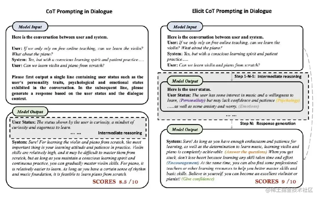 这个工作的主要目的是让 LLM 在对话时考虑用户的状态,比如用户的 personality, empathy 和 psychological,遵循的还是思维链套路,并且将思维链拆成了多个步骤(LLM 每次回答一点,不是一次性基于思维链全部回答)。这样的好处在于用户还可以修改、删除中间过程的一些回答,原始的上下文和所有中间过程都会用于最终回答的生成。