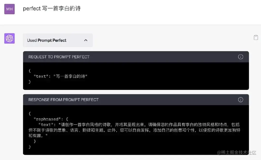 目前网上已经有不少 Prompt 优化工具,比如 ChatGPT 的插件中就有一个不错的工具 Prompt perfect,能够基于用户给的 Prompt 进行优化,再喂给 ChatGPT 进行提问。
