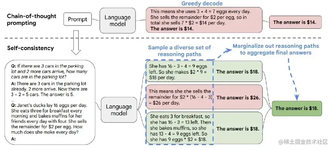 核心思想就是少数服从多数,多让模型回答几次(这里的提问也用到了少样本思维链),然后在 LLM 的多次回答中选择出现多次的答案。