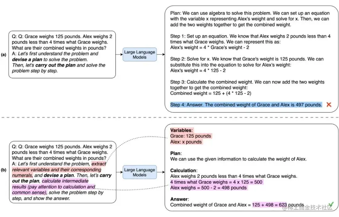为了进一步增强 PS 提示的效果,作者扩展了它,形成了一种名为 PS+的新提示方式。PS+提示在 PS 提示的基础上,添加了“pay attention to calculation”这样的引导语句,要求模型在计算过程中更加精确。为了避免模型在处理问题时忽略了关键的变量和数值,PS+提示还增加了“extract relevant variables and their corresponding numerals”这样的引导语句。此外,为了强化模型在推理过程中计算中间结果的能力,PS+提示也加入了“calculate intermediate results”这样的引导语句。通过这种方式,PS+提示进一步提高了模型在处理多步推理任务时的效果。