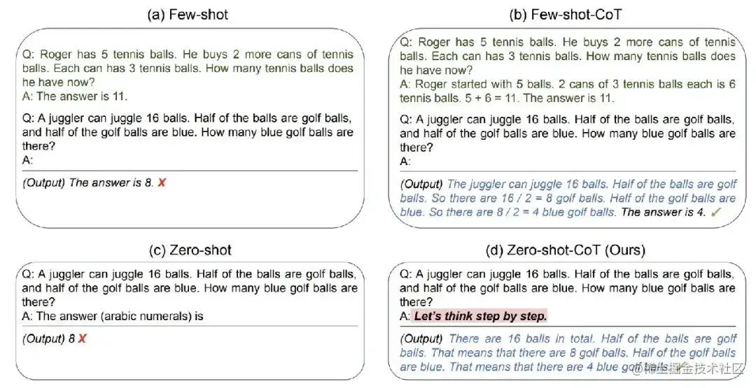 零样本思维链: 嫌弃提供中间过程太麻烦?偷懒的办法来了,零样本思维链通过一句 magic prompt 实现了这一目标 “Let’s think step by step”。