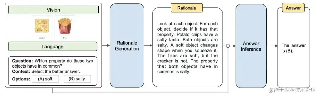 理由生成: 在这个阶段,我们将语言和视觉输入提供给模型,以生成推理的理由。这个理由可以看作是解决问题的中间步骤或思考链的一部分。这个过程可以帮助模型理解问题的上下文,并为下一步的答案推断做好准备。