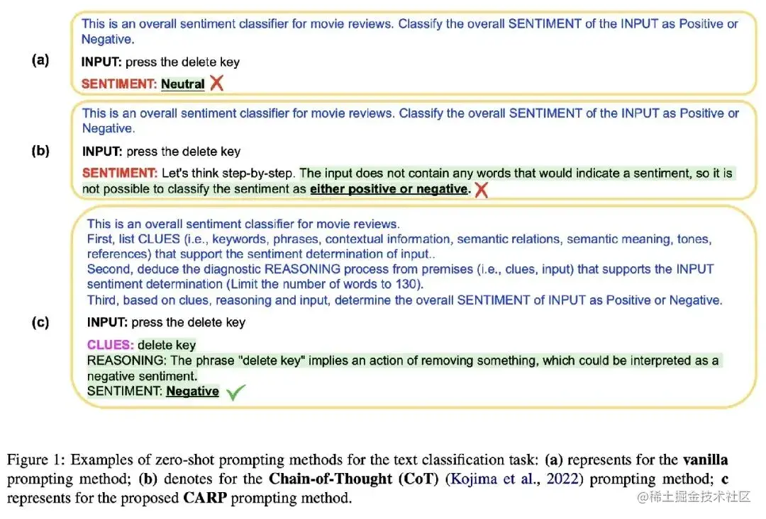 Clue and Reasoning Prompting (CARP) 是一种用于文本分类的方法,它首先提示大型语言模型(LLMs)寻找表面线索,例如关键词、语调、语义关系、引用等,然后基于这些线索引导出一个诊断推理过程进行最终决策。