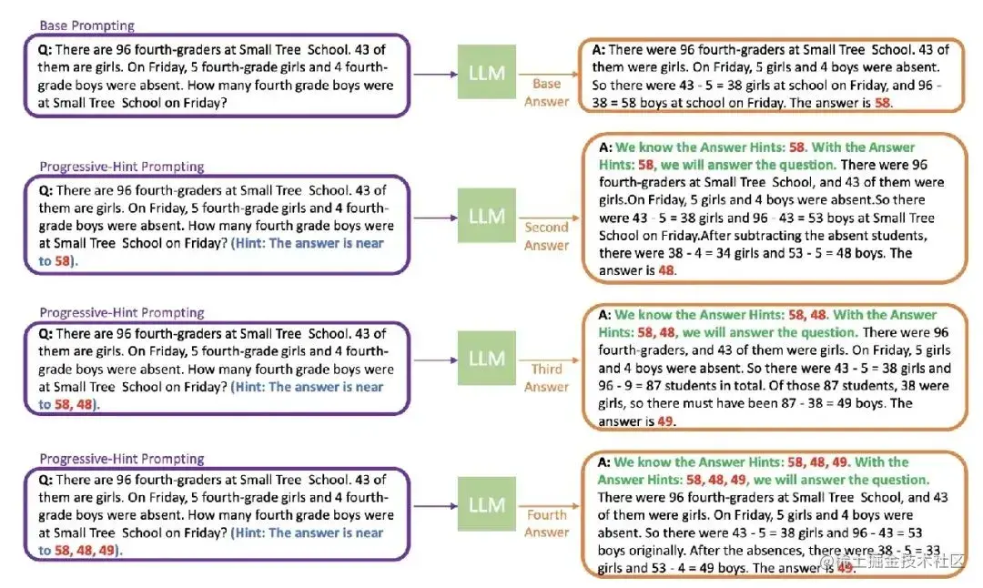 在 PHP 方法中,首次与 LLM 交互使用的 Prompt 称为基础提示(Base Prompting)。基础提示可以是标准提示、CoT 提示或者其他改进版本的提示。在随后的交互中,将使用 PHP 提示,直到最新的两个答案一致。