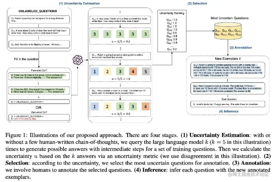 本质上还是思维链,由于人工设计的思维链或者自动化思维链的结果也并不一定理想(思维链的设计跟具体任务相关),因此提出了用不确定性来评估思维链的好坏,然后再让人来修正一些不确定性比较大的思维链。
