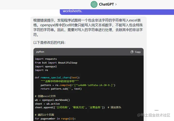 运行程序后,爬取到第14页时出错了,把错误信息发送给ChatGPT,回复如下: