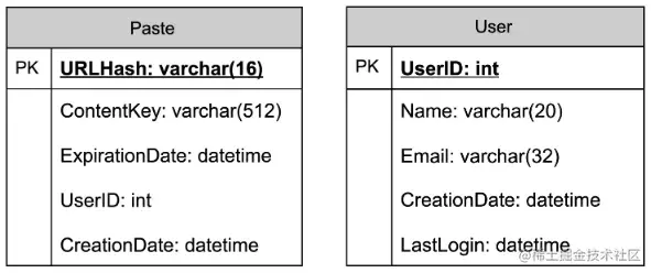 这里,URlHash是TinyURL的URL等效项,ContentKey是指向一个外部对象的引用,该对象存储粘贴内容的内容;我们将在本章后面讨论粘贴内容的外部存储。