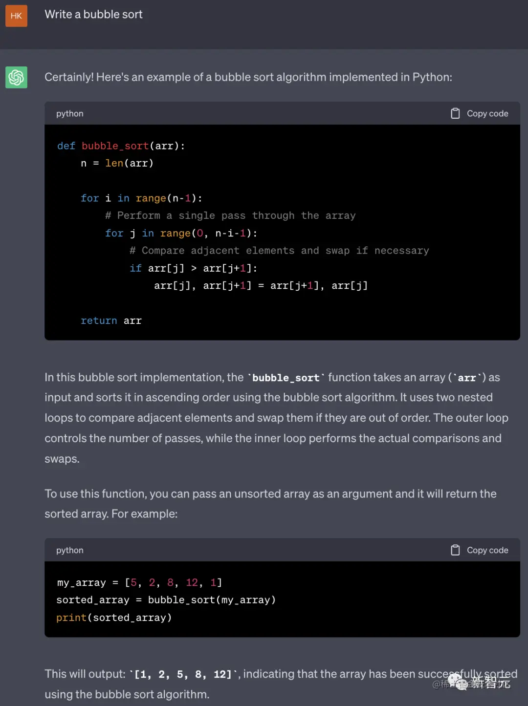 秒秒钟,ChatGPT就生成了相应的Python代码,并且配上了简单的讲解。