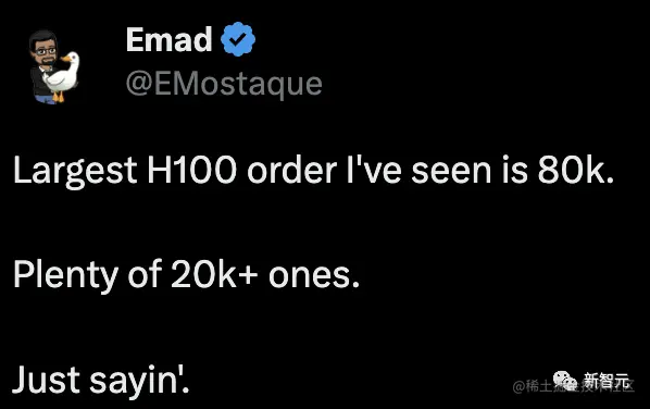 Stability AI的创始人兼首席执行官Mohammad Emad Mostaque表示,我所看到的最大的H100订单是8万。有很多2万以上的订单。只是说说而已。