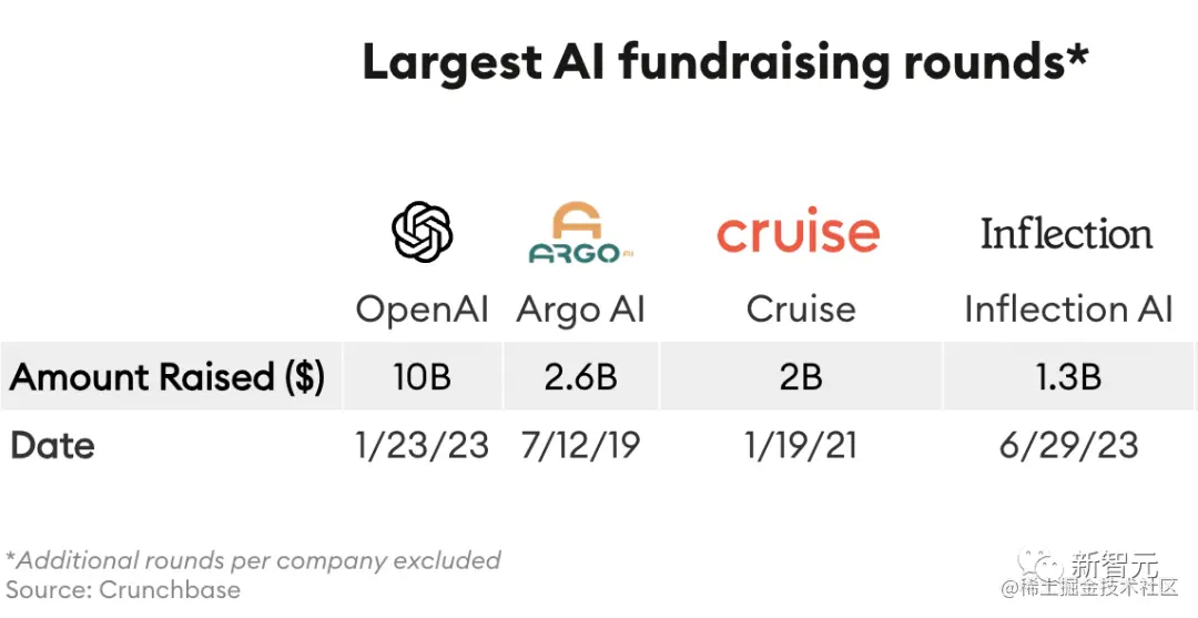 根据Crunchbase统计的每轮最大AI融资机构中,OpenAI位列第一,Inflection排在了第四位。