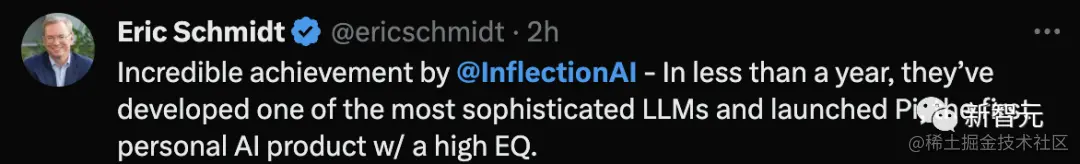 就连谷歌前CEO Eric Schmidt大家赞赏,InflectionAI取得了令人难以置信的成就。在不到一年的时间里,他们开发了最复杂的LLM之一,并推出了Pi,第一个具有高情商的个人AI产品。
