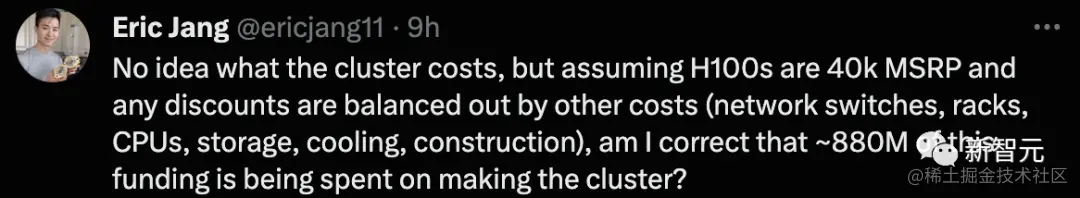 我不知道集群的成本是多少,但假设H100的MSRP是4万,任何折扣都被其他成本(网络交换机、机架、CPU、存储、冷却、建筑)所平衡,不是到这些资金中是否大约8.8亿是用于制造集群?