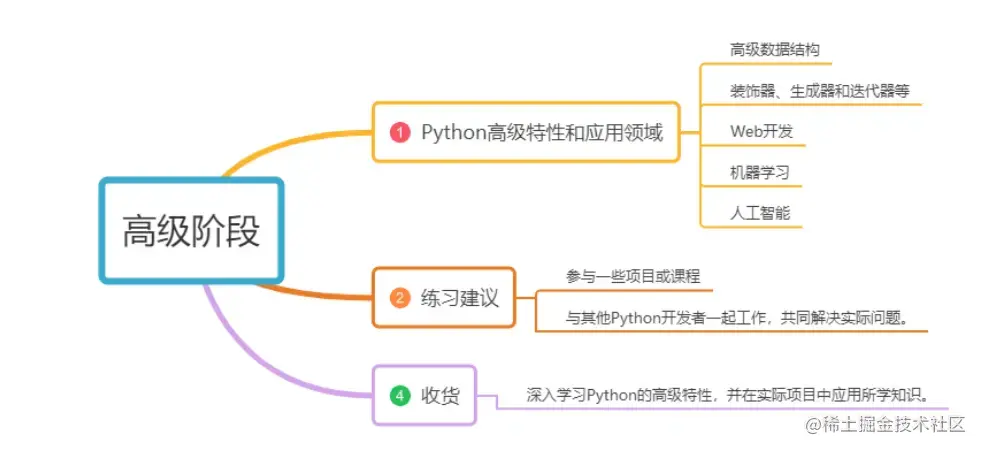 收获:中级阶段的主要目标是深入学习Python的高级特性,并熟悉常用的Python库和工具。