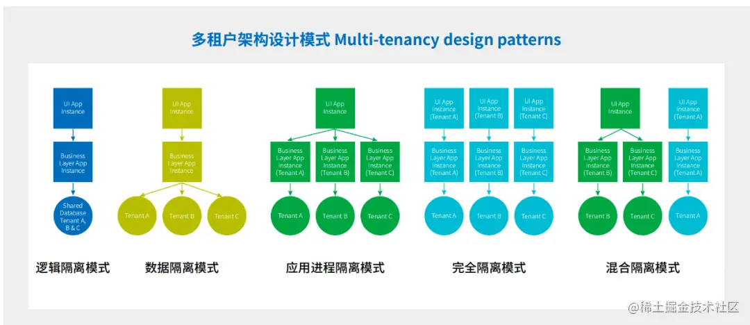 我们以上面提到的中台如何提供一致的服务等级这个问题为例,经过分析,背后的技术问题定义是如何处理接入前台之间的跨功能需求 (安全、存储、性能、可靠性等)隔离问题,由此可以快速确定对应的基础架构是多租户(Multi-tenancy)架构。