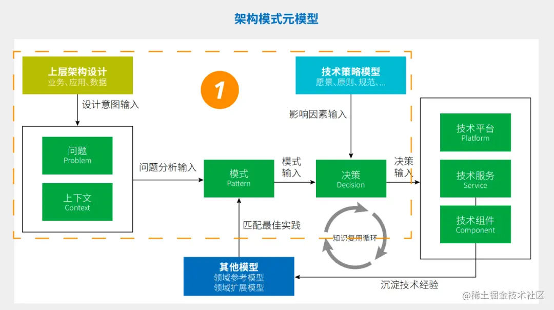 通常使用问题、上下文对上层设计意图进行系统性的分析后,得到的问题如果准确,那么它在业界往往已经存在成熟的解决方案模式可以参考。架构模式元模型的价值是帮助企业识别和利用已经成熟的最佳实践,提高架构设计质量,降低架构设计成本